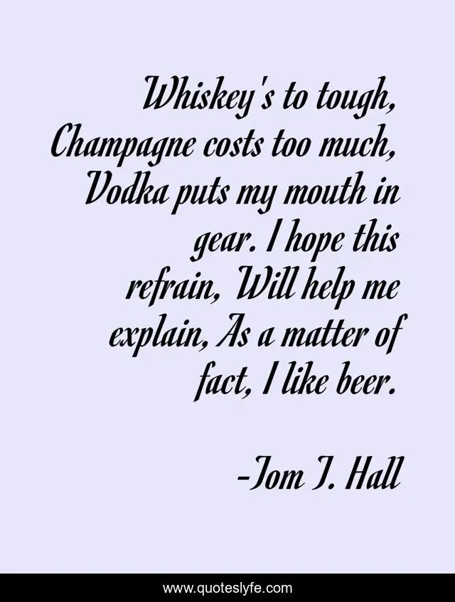 This page presents the quote "Whiskey's to tough, Champagne costs too much, Vodka puts my mouth in gear. I hope this refrain, Will help me explain, As a matter of fact, I like beer.". Author of this quote is Tom T. Hall. This quote is about me, beer, help,.