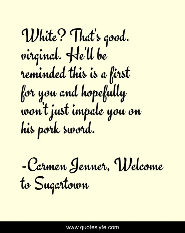 This page presents the quote "White? That's good. virginal. He'll be reminded this is a first for you and hopefully won't just impale you on his pork sword.". Author of this quote is Carmen Jenner, Welcome to Sugartown. .