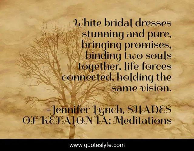 This page presents the quote "White bridal dresses stunning and pure, bringing promises, binding two souls together, life forces connected, holding the same vision.". Author of this quote is Jennifer Lynch, SHADES OF KEFALONIA: Meditations. This quote is about promises, souls, life-force, pure, bridal, vision,.