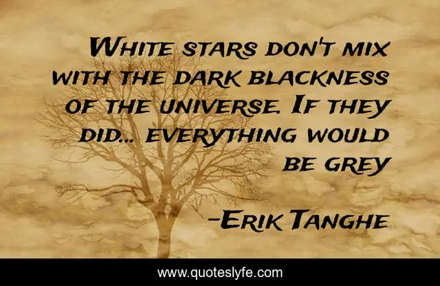 This page presents the quote "White stars don't mix with the dark blackness of the universe. If they did... everything would be grey". Author of this quote is Erik Tanghe. This quote is about star, darkness, brightness, white-stars, universe, grey, mix, blackness, stars,.