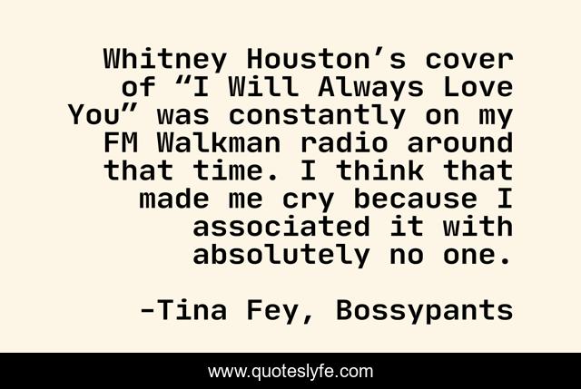 This page presents the quote "Whitney Houston’s cover of “I Will Always Love You” was constantly on my FM Walkman radio around that time. I think that made me cry because I associated it with absolutely no one.". Author of this quote is Tina Fey, Bossypants. This quote is about whitney-houston, funny, comedy, humor,.