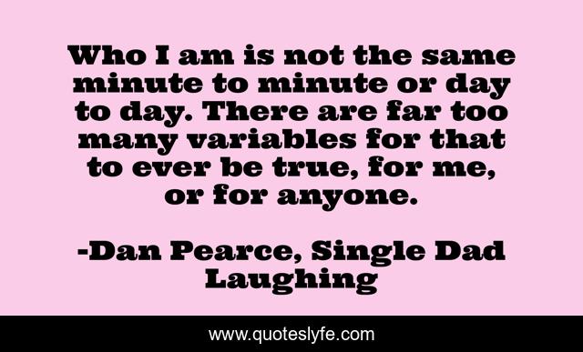 This page presents the quote "Who I am is not the same minute to minute or day to day. There are far too many variables for that to ever be true, for me, or for anyone.". Author of this quote is Dan Pearce, Single Dad Laughing. This quote is about changing, life, consistency, change, human-nature,.