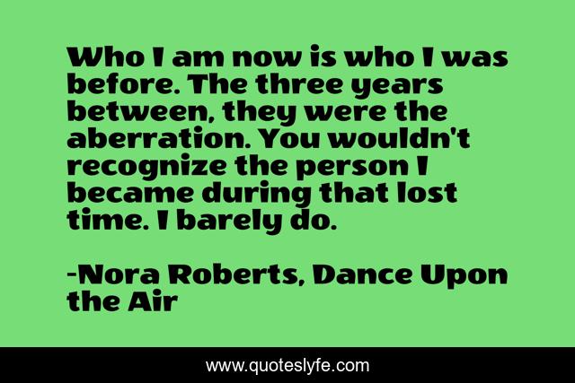 This page presents the quote "Who I am now is who I was before. The three years between, they were the aberration. You wouldn't recognize the person I became during that lost time. I barely do.". Author of this quote is Nora Roberts, Dance Upon the Air. .