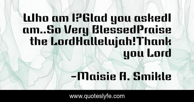 This page presents the quote "Who am I?Glad you askedI am..So Very BlessedPraise the LordHallelujah!Thank you Lord". Author of this quote is Maisie A. Smikle. This quote is about enthusiasm, inspirational,.