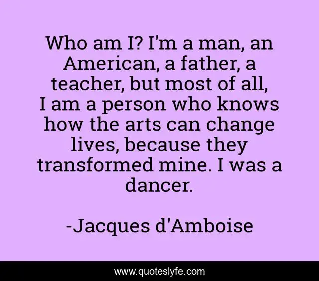This page presents the quote "Who am I? I'm a man, an American, a father, a teacher, but most of all, I am a person who knows how the arts can change lives, because they transformed mine. I was a dancer.". Author of this quote is Jacques d'Amboise. This quote is about father, change,.