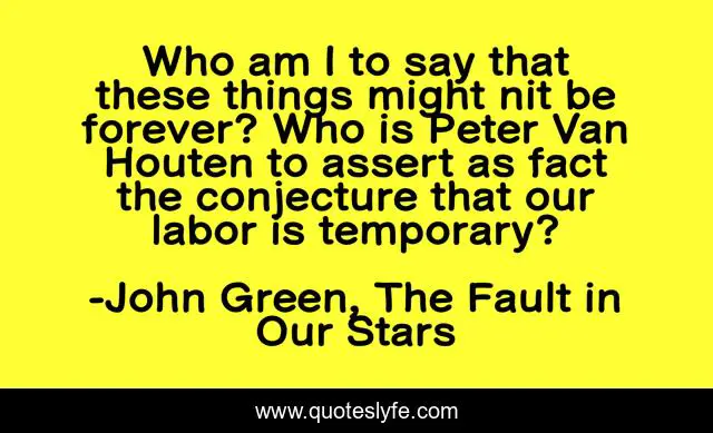 This page presents the quote "Who am I to say that these things might nit be forever? Who is Peter Van Houten to assert as fact the conjecture that our labor is temporary?". Author of this quote is John Green, The Fault in Our Stars. .