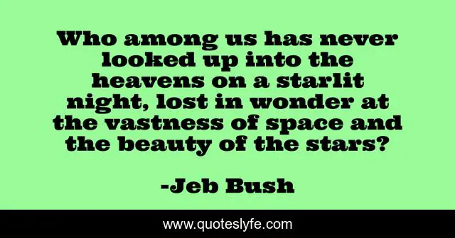 This page presents the quote "Who among us has never looked up into the heavens on a starlit night, lost in wonder at the vastness of space and the beauty of the stars?". Author of this quote is Jeb Bush. This quote is about beauty, stars, night,.