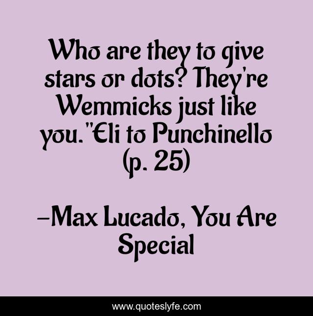 This page presents the quote "Who are they to give stars or dots? They're Wemmicks just like you."Eli to Punchinello (p. 25)". Author of this quote is Max Lucado, You Are Special. This quote is about enthusiasm, advice, inspirational,.