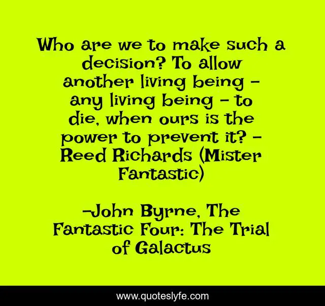 This page presents the quote "Who are we to make such a decision? To allow another living being - any living being - to die, when ours is the power to prevent it? - Reed Richards (Mister Fantastic)". Author of this quote is John Byrne, The Fantastic Four: The Trial of Galactus. This quote is about compassion, sanctity-of-life, life, death, power-of-life-and-death,.