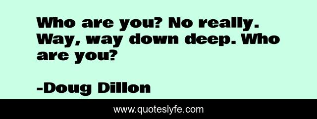 This page presents the quote "Who are you? No really. Way, way down deep. Who are you?". Author of this quote is Doug Dillon. This quote is about spirituality, philosophy, identify, inspiration, reality,.
