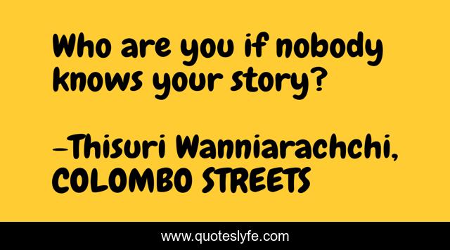 This page presents the quote "Who are you if nobody knows your story?". Author of this quote is Thisuri Wanniarachchi, COLOMBO STREETS. This quote is about living, life, south-asia, soul, thisuri-wanniarachchi, life-lessons-value-of-life-truth, happiness,.