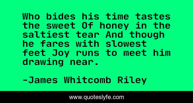 This page presents the quote "Who bides his time tastes the sweet Of honey in the saltiest tear And though he fares with slowest feet Joy runs to meet him drawing near.". Author of this quote is James Whitcomb Riley. This quote is about days, difficult,.