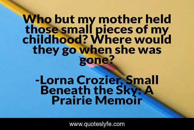 This page presents the quote "Who but my mother held those small pieces of my childhood? Where would they go when she was gone?". Author of this quote is Lorna Crozier, Small Beneath the Sky: A Prairie Memoir. This quote is about grief, mothers,.