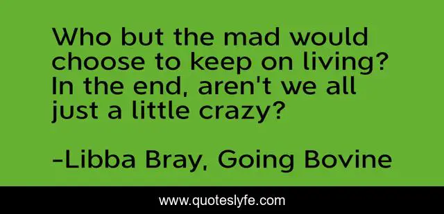 This page presents the quote "Who but the mad would choose to keep on living? In the end, aren't we all just a little crazy?". Author of this quote is Libba Bray, Going Bovine. This quote is about crazy, death, madness, life,.