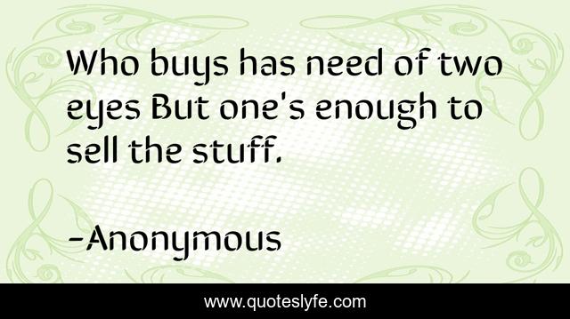 This page presents the quote "Who buys has need of two eyes But one's enough to sell the stuff.". Author of this quote is Anonymous. This quote is about selling, buying,.