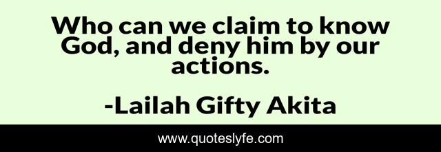This page presents the quote "Who can we claim to know God, and deny him by our actions.". Author of this quote is Lailah Gifty Akita. This quote is about faith, christian, god, saints, theology, preachers, pastors, action, religion-and-philoshophy,.