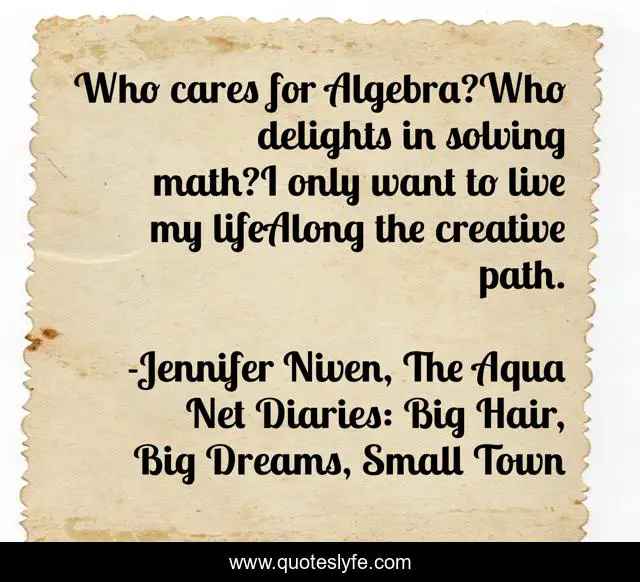 "Jennifer Niven, The Aqua Net Diaries: Big Hair, Big Dreams, Small Town Quotes." Quoteslyfe.com, 2025. Tue. 09 Dec. 2025. <https://www.quoteslyfe.com/quote/Who-cares-for-Algebra-Who-delights-in-108670>.