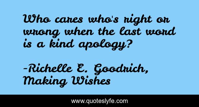 This page presents the quote "Who cares who's right or wrong when the last word is a kind apology?". Author of this quote is Richelle E. Goodrich, Making Wishes. This quote is about right, apologizing, regret, apology, richelle-e-goodrich, right-or-wrong, meekness, wrong, richelle,.