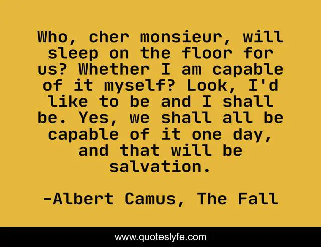 This page presents the quote "Who, cher monsieur, will sleep on the floor for us? Whether I am capable of it myself? Look, I'd like to be and I shall be. Yes, we shall all be capable of it one day, and that will be salvation.". Author of this quote is Albert Camus, The Fall. This quote is about first-person, existentialism, philosophy,.