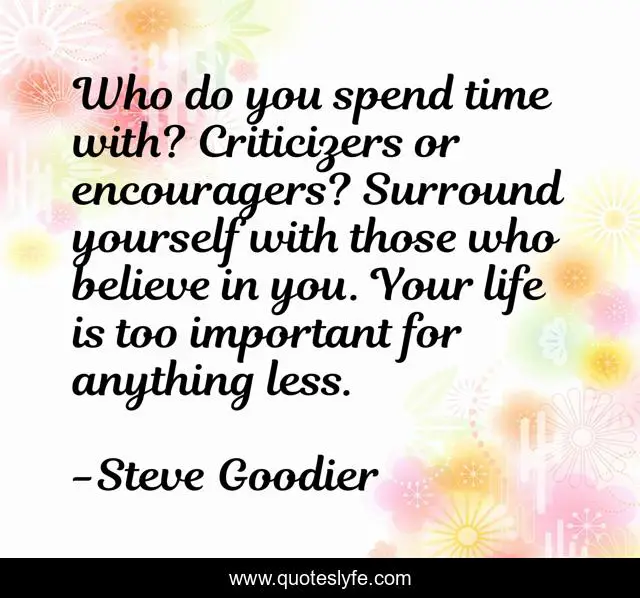 This page presents the quote "Who do you spend time with? Criticizers or encouragers? Surround yourself with those who believe in you. Your life is too important for anything less.". Author of this quote is Steve Goodier. This quote is about criticism, positive, confidence, encouragement, time,.