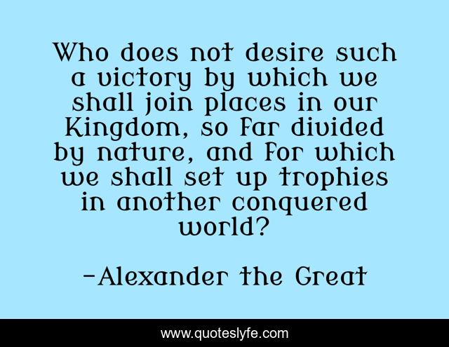 This page presents the quote "Who does not desire such a victory by which we shall join places in our Kingdom, so far divided by nature, and for which we shall set up trophies in another conquered world?". Author of this quote is Alexander the Great. This quote is about desire, world, victory,.