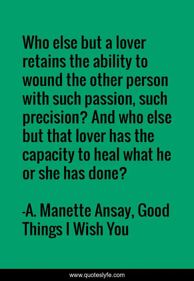 This page presents the quote "Who else but a lover retains the ability to wound the other person with such passion, such precision? And who else but that lover has the capacity to heal what he or she has done?". Author of this quote is A. Manette Ansay, Good Things I Wish You. .