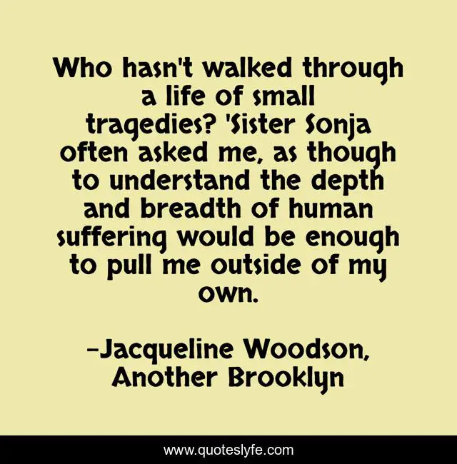 This page presents the quote "Who hasn't walked through a life of small tragedies? 'Sister Sonja often asked me, as though to understand the depth and breadth of human suffering would be enough to pull me outside of my own.". Author of this quote is Jacqueline Woodson, Another Brooklyn. This quote is about grief, depression,.