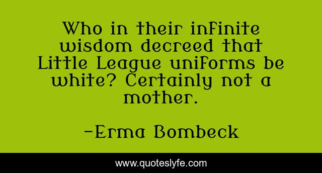 This page presents the quote "Who in their infinite wisdom decreed that Little League uniforms be white? Certainly not a mother.". Author of this quote is Erma Bombeck. This quote is about wisdom, mother,.