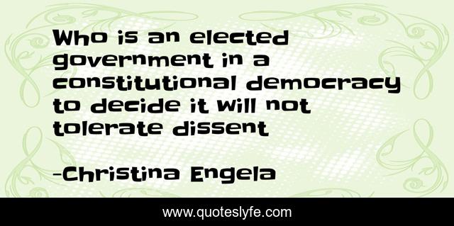 This page presents the quote "Who is an elected government in a constitutional democracy to decide it will not tolerate dissent". Author of this quote is Christina Engela. This quote is about democracy, government, dissent, tolerate, elected, constitutional,.