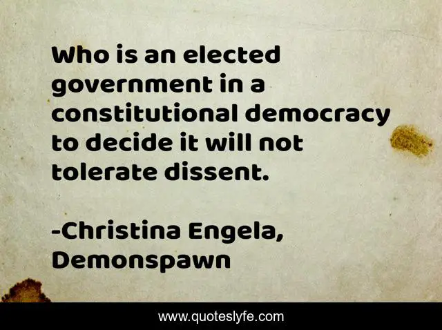 This page presents the quote "Who is an elected government in a constitutional democracy to decide it will not tolerate dissent.". Author of this quote is Christina Engela, Demonspawn. This quote is about democracy, government, dissent, not-tolerate, elected, constitutional,.