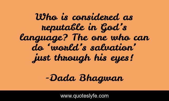 This page presents the quote "Who is considered as reputable in God’s language? The one who can do ‘world’s salvation’ just through his eyes!". Author of this quote is Dada Bhagwan. This quote is about spiritual, salvation-by-grace, god, salvation-of-the-world, reputable, salvation,.
