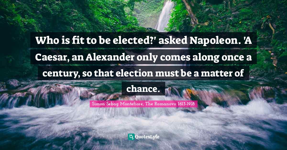 This page presents the quote "Who is fit to be elected?' asked Napoleon. 'A Caesar, an Alexander only comes along once a century, so that election must be a matter of chance.". Author of this quote is Simon Sebag Montefiore, The Romanovs: 1613-1918. This quote is about democracy, autocracy, romantic-individual, dynasty, chronology, chance, election, aristocracy, politics,.