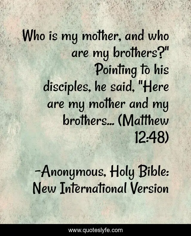 This page presents the quote "Who is my mother, and who are my brothers?" Pointing to his disciples, he said, "Here are my mother and my brothers... (Matthew 12:48)". Author of this quote is Anonymous, Holy Bible: New International Version. This quote is about disciples, brothers, family, mother,.