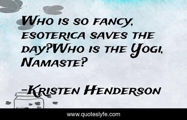 This page presents the quote "Who is so fancy, esoterica saves the day?Who is the Yogi, Namaste?". Author of this quote is Kristen Henderson. This quote is about namaste, esoterica, question, couplet, yogi, spirituality, bs,.