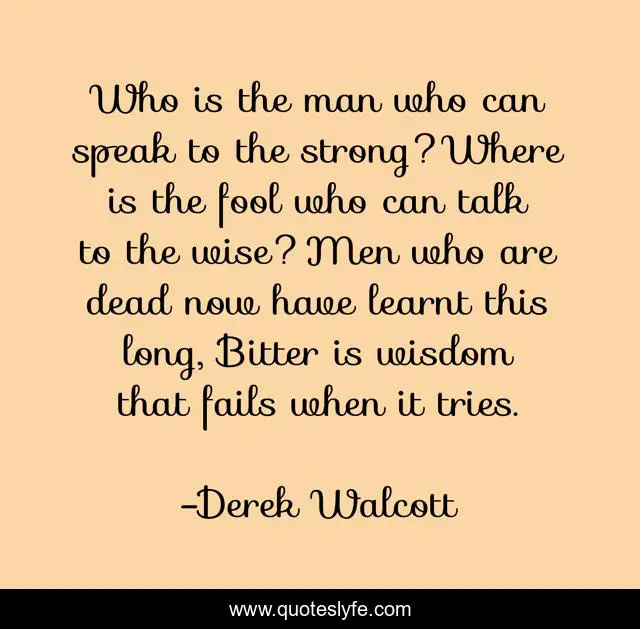 This page presents the quote "Who is the man who can speak to the strong?Where is the fool who can talk to the wise?Men who are dead now have learnt this long, Bitter is wisdom that fails when it tries.". Author of this quote is Derek Walcott. This quote is about failure, bitterness, wisdom,.