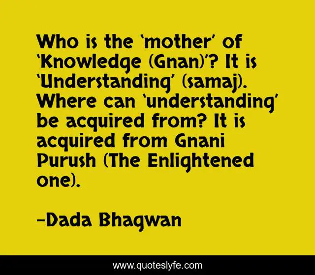 This page presents the quote "Who is the ‘mother’ of ‘Knowledge (Gnan)’? It is ‘Understanding’ (samaj). Where can ‘understanding’ be acquired from? It is acquired from Gnani Purush (The Enlightened one).". Author of this quote is Dada Bhagwan. This quote is about enlightened-one, gnan, knowledge, understanding,.
