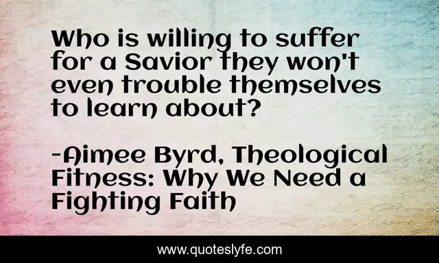 This page presents the quote "Who is willing to suffer for a Savior they won't even trouble themselves to learn about?". Author of this quote is Aimee Byrd, Theological Fitness: Why We Need a Fighting Faith. This quote is about faith, christianity, perseverance,.