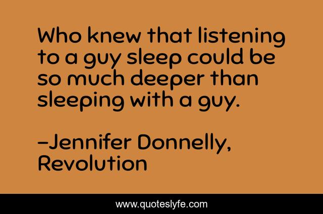 This page presents the quote "Who knew that listening to a guy sleep could be so much deeper than sleeping with a guy.". Author of this quote is Jennifer Donnelly, Revolution. .