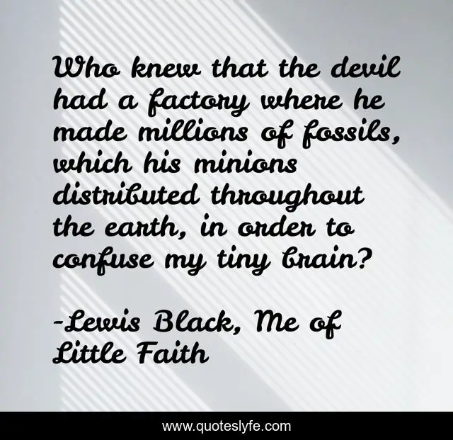 This page presents the quote "Who knew that the devil had a factory where he made millions of fossils, which his minions distributed throughout the earth, in order to confuse my tiny brain?". Author of this quote is Lewis Black, Me of Little Faith. This quote is about atheism, atheist, humor, noremorse, religion,.