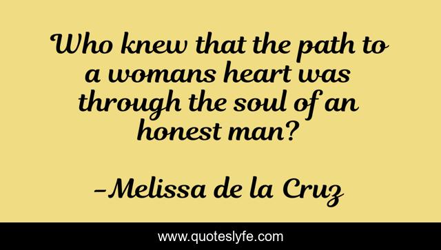 This page presents the quote "Who knew that the path to a womans heart was through the soul of an honest man?". Author of this quote is Melissa de la Cruz. This quote is about sweet, love, soul, affection, victory,.