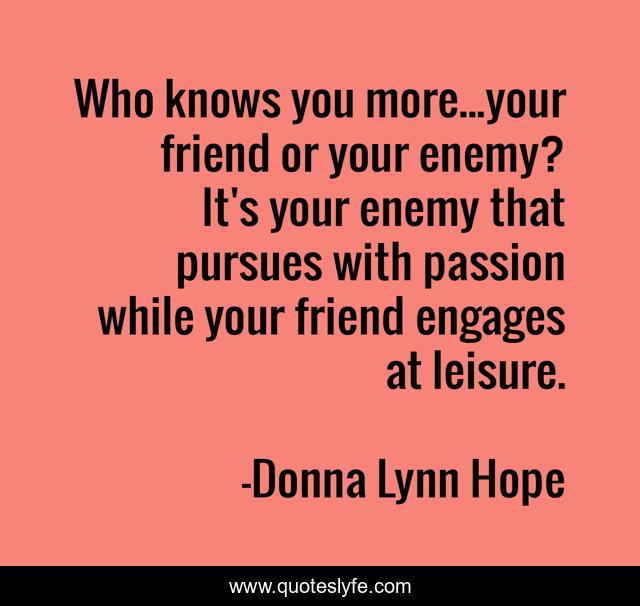 This page presents the quote "Who knows you more...your friend or your enemy? It's your enemy that pursues with passion while your friend engages at leisure.". Author of this quote is Donna Lynn Hope. This quote is about enemy, adversary, pursue, friends, friendship, pursues, enemies,.