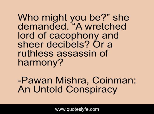 This page presents the quote "Who might you be?” she demanded. “A wretched lord of cacophony and sheer decibels? Or a ruthless assassin of harmony?". Author of this quote is Pawan Mishra, Coinman: An Untold Conspiracy. This quote is about sound, decibels, cacophony, harmony, assassin,.