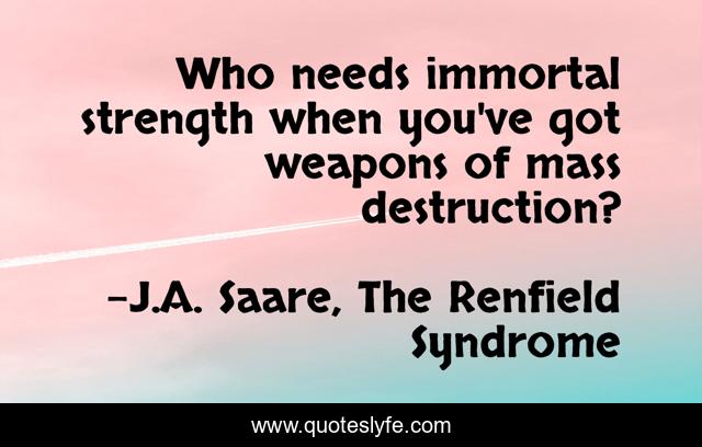 This page presents the quote "Who needs immortal strength when you've got weapons of mass destruction?". Author of this quote is J.A. Saare, The Renfield Syndrome. This quote is about ja-saare, weapons, immortality, rhiannon, rhiannon-s-law, renfield-syndrome,.