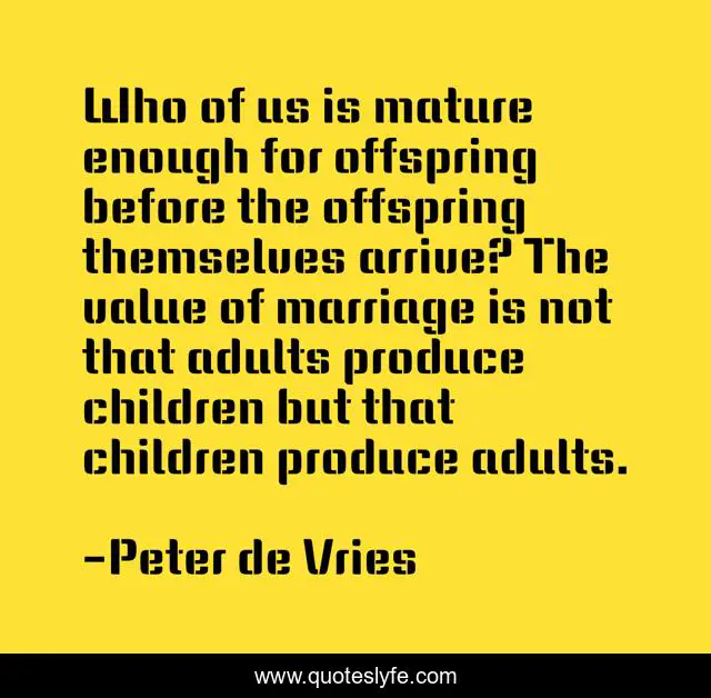 This page presents the quote "Who of us is mature enough for offspring before the offspring themselves arrive? The value of marriage is not that adults produce children but that children produce adults.". Author of this quote is Peter de Vries. This quote is about ancestry, family,.