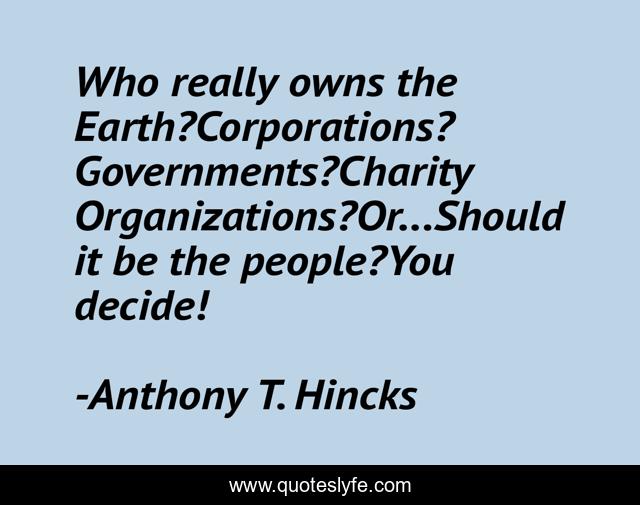 This page presents the quote "Who really owns the Earth?Corporations? Governments?Charity Organizations?Or...Should it be the people?You decide!". Author of this quote is Anthony T. Hincks. This quote is about life, owns, philosophy, corporations, decide, earth, world, governments, charity,.