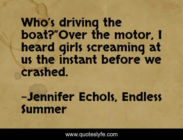 This page presents the quote "Who’s driving the boat?”Over the motor, I heard girls screaming at us the instant before we crashed.". Author of this quote is Jennifer Echols, Endless Summer. This quote is about funny, young-adult-fiction, young-adult-romance, comedy, humour,.
