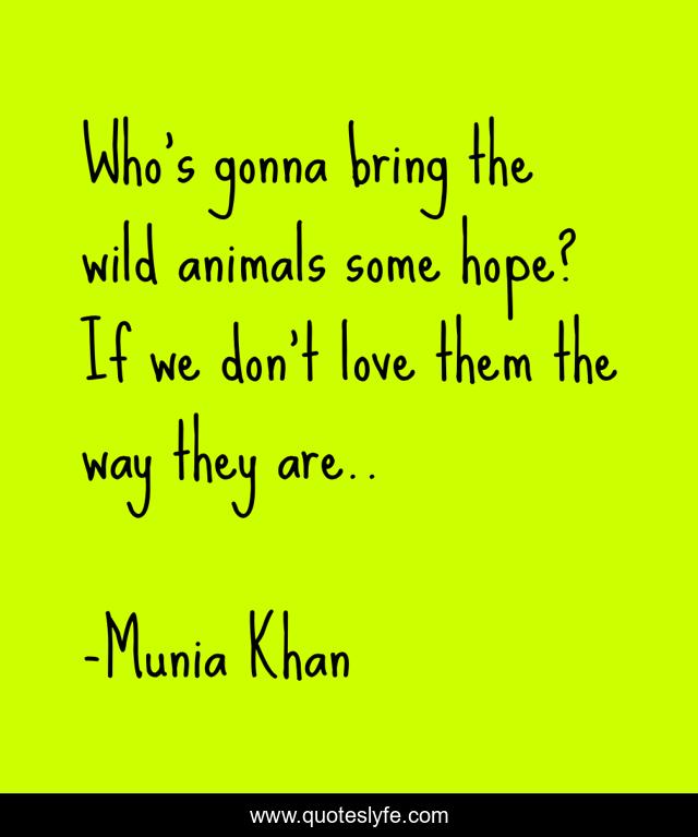 This page presents the quote "Who’s gonna bring the wild animals some hope? If we don’t love them the way they are..". Author of this quote is Munia Khan. This quote is about wild-animals, wildlife, animals, animal-welfare, animal-rights, bring, hopelessness, hope, animal,.