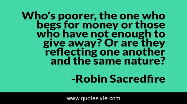 This page presents the quote "Who's poorer, the one who begs for money or those who have not enough to give away? Or are they reflecting one another and the same nature?". Author of this quote is Robin Sacredfire. This quote is about money, rags-to-riches, wealth,.