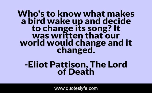 This page presents the quote "Who's to know what makes a bird wake up and decide to change its song? It was written that our world would change and it changed.". Author of this quote is Eliot Pattison, The Lord of Death. This quote is about destiny, fate, bird-song, karma, changes, metaphors,.