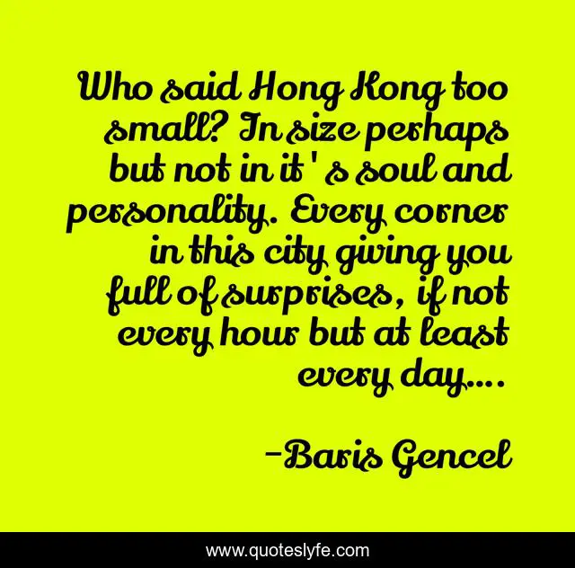 This page presents the quote "Who said Hong Kong too small? In size perhaps but not in it's soul and personality. Every corner in this city giving you full of surprises, if not every hour but at least every day….". Author of this quote is Baris Gencel. This quote is about hong-kong-sixes, city, hong-kong, hongkong,.